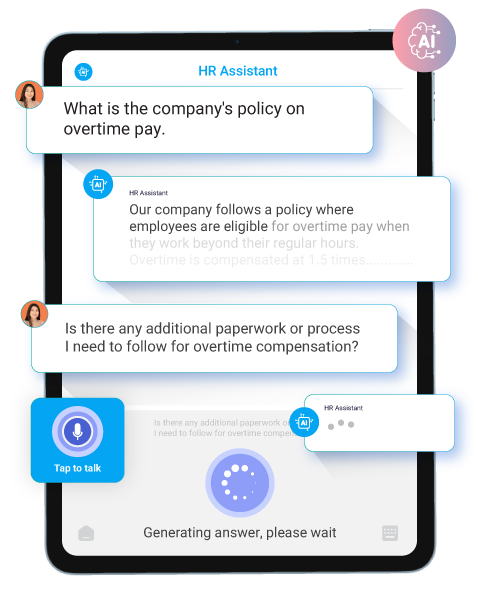 Empowering employees with the ability to find answers independently is a cornerstone of efficient HR management. CloudApper hrPad’s self-service kiosk provides employees with a user-friendly platform to address their routine queries and perform their HR-related tasks. By accessing the AI Assistant within the UKG system, employees can swiftly navigate through a wide array of commonly asked questions and receive instant responses. This seamless self-service functionality boosts employee satisfaction and reduces the HR team’s burden for routine inquiries.