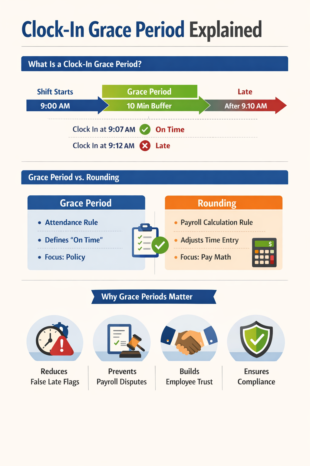 Grace periods exist because timekeeping is rarely perfect in the real world. People hit traffic, security lines back up, devices take time to authenticate, and shift handoffs don’t always happen on the minute. The goal is to balance accountability with fairness, while keeping payroll clean.