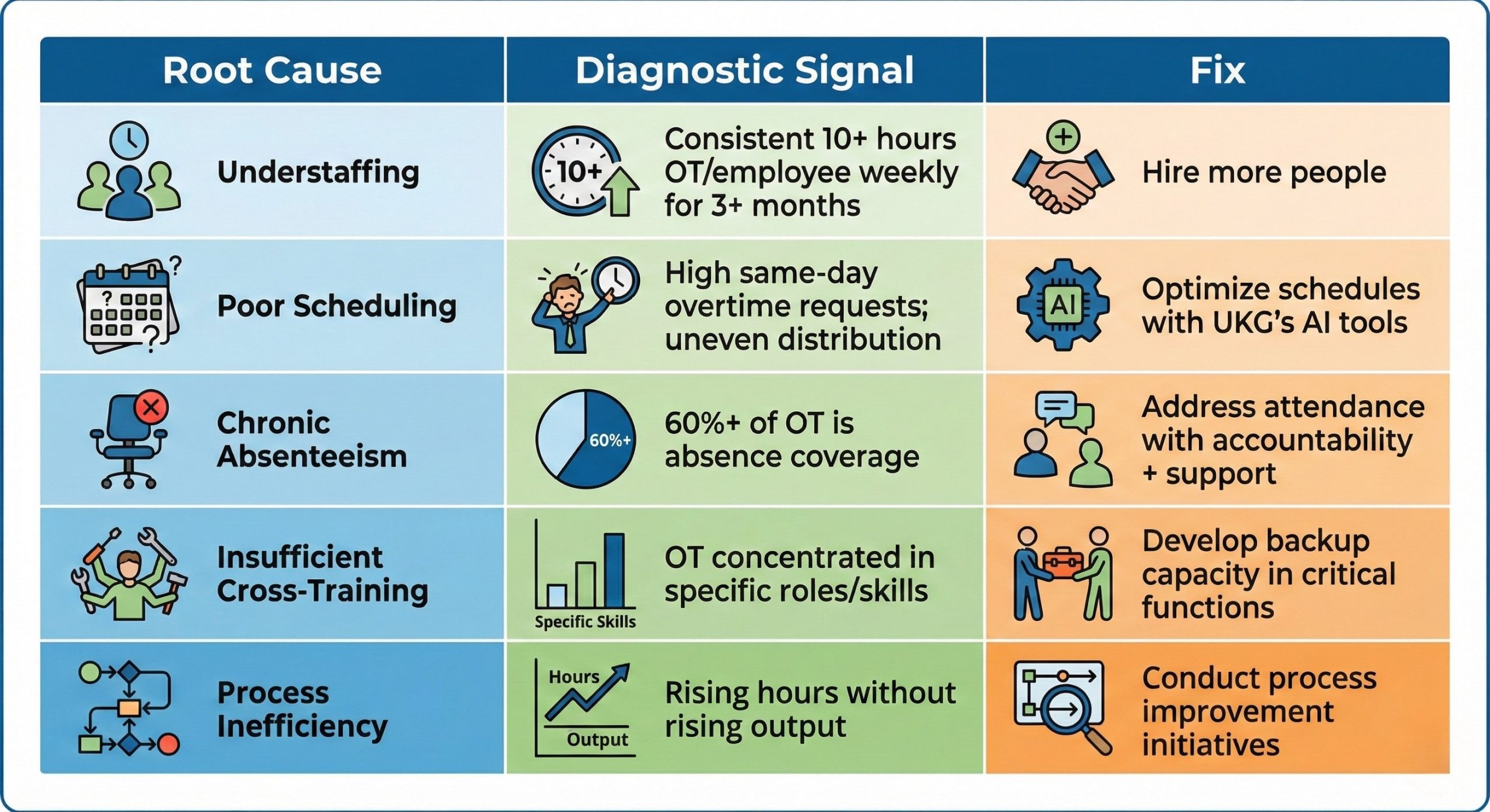 Before you can manage overtime, you need to understand why it’s happening. Run this diagnostic: