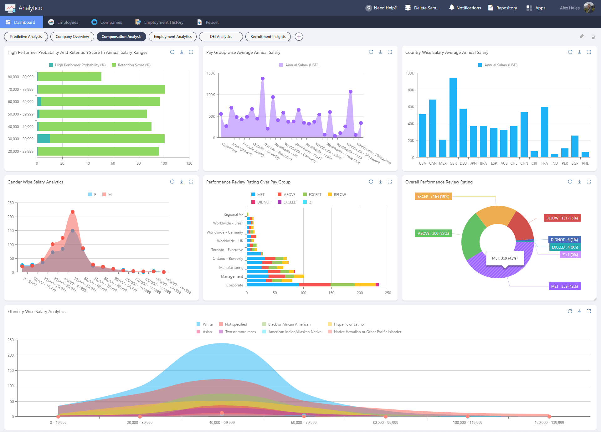 A2: Analytico offers various customizable dashboards, including predictive analysis, compensation analysis, employment analytics, DEI analytics, and recruitment insights.