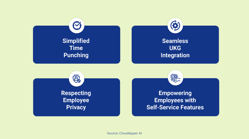 CloudApper's iPad AI TimeClock for UKG/Kronos enhances employee satisfaction by streamlining timekeeping, respecting privacy, and integrating seamlessly with UKG. With user-friendly interfaces and self-service features, it empowers employees and boosts productivity.