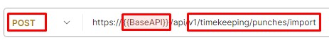 The method is POST and the endpoint of the URL is /v1/timekeeping/punches/import while the base URL of your company should go to the {{BaseAPI}} portion.