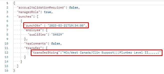 As depicted in the image provided, the punch date and time are included under the key ‘punchDtm’. The employee identifier, which corresponds to the employee’s person number, is sent under the ‘qualifier’ key, while the business structure string representing the transferred job is included under the ‘transferString’ key. Upon transmission through a third-party application or Postman using this API, the data will be automatically updated on the employee’s UKG Pro WFM/Dimensions timecard.