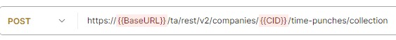 The method employed is POST, and the endpoint URL is /ta/rest/v2/companies/{{CID}}/time-punches/collection