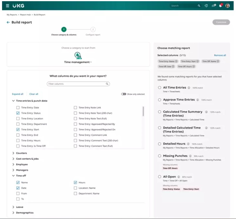 A two-step procedure that expedites your path to the ideal report is introduced by the Custom Report Builder. Report criteria selection is the first step. The first step is selecting the reporting category and module that best suits your needs—such as payroll, benefits, hiring, timekeeping, or more—. It’s simple to search for particular columns; simply enter the keyword, and the system will display a list of columns that fit into your chosen category. You can further hone your search parameters by adding up to 15 data points. After that, the system works its magic, verifying your choices and presenting you with a ranked list of reports that are almost exactly what you need.
