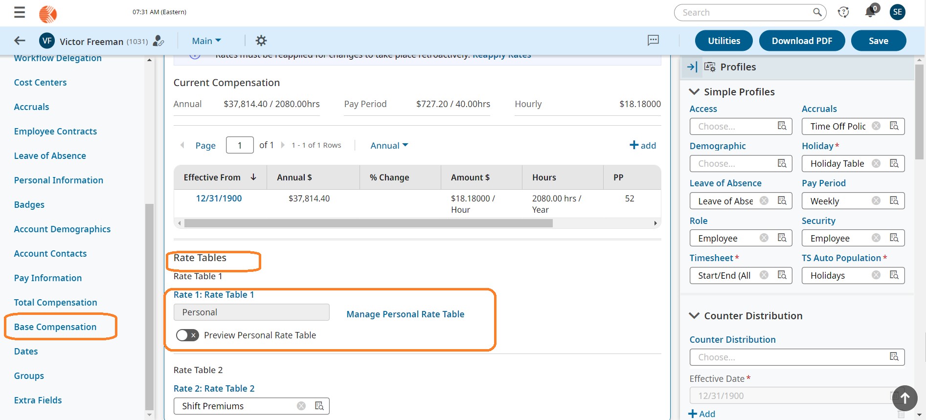 Locate the Base Compensation section. Click on Manage personal rate table