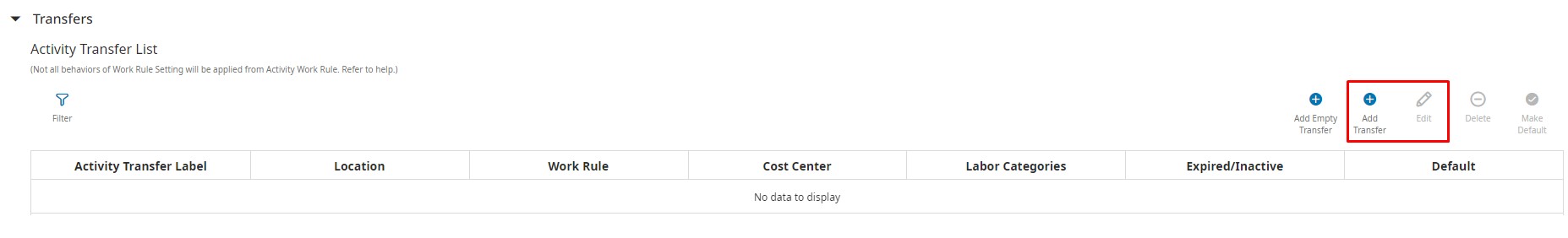 You’ll find two options within the Activity Transfer List: adding a new transfer or editing an existing one. Utilize the standard process to configure the Activity Transfer details by selecting the appropriate defaults and assigning unique labels to each transfer.