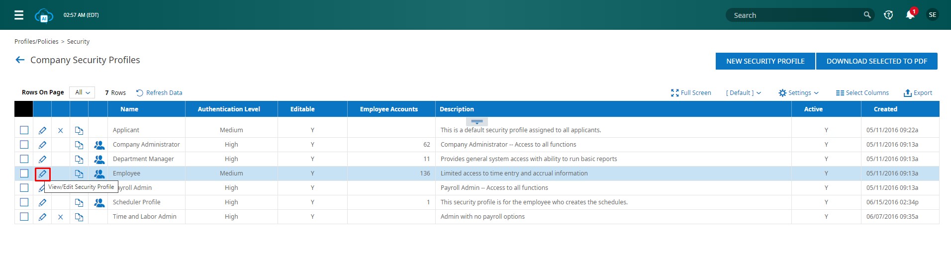 - On the Company Security Profiles page, click on the pen icon called View/Edit Security Profile corresponding to the relevant employee level.