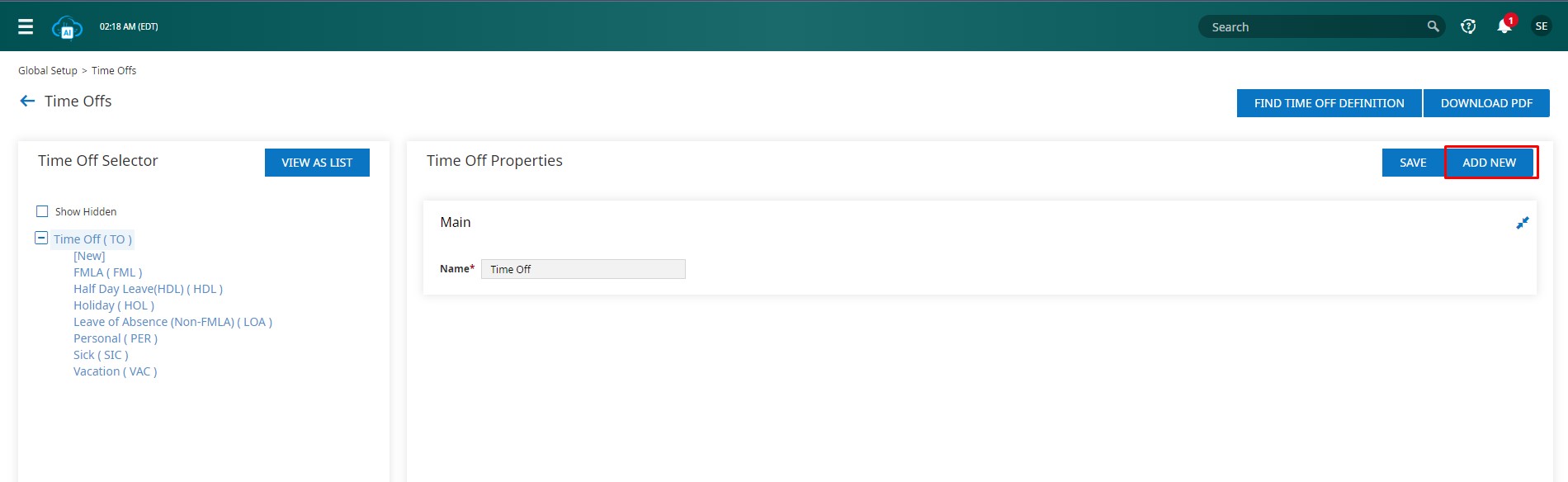 - Within the Time Off Properties widget, click on “Add New.” This action creates a new Time Off labeled as “[New]” along with new Time Off Properties.