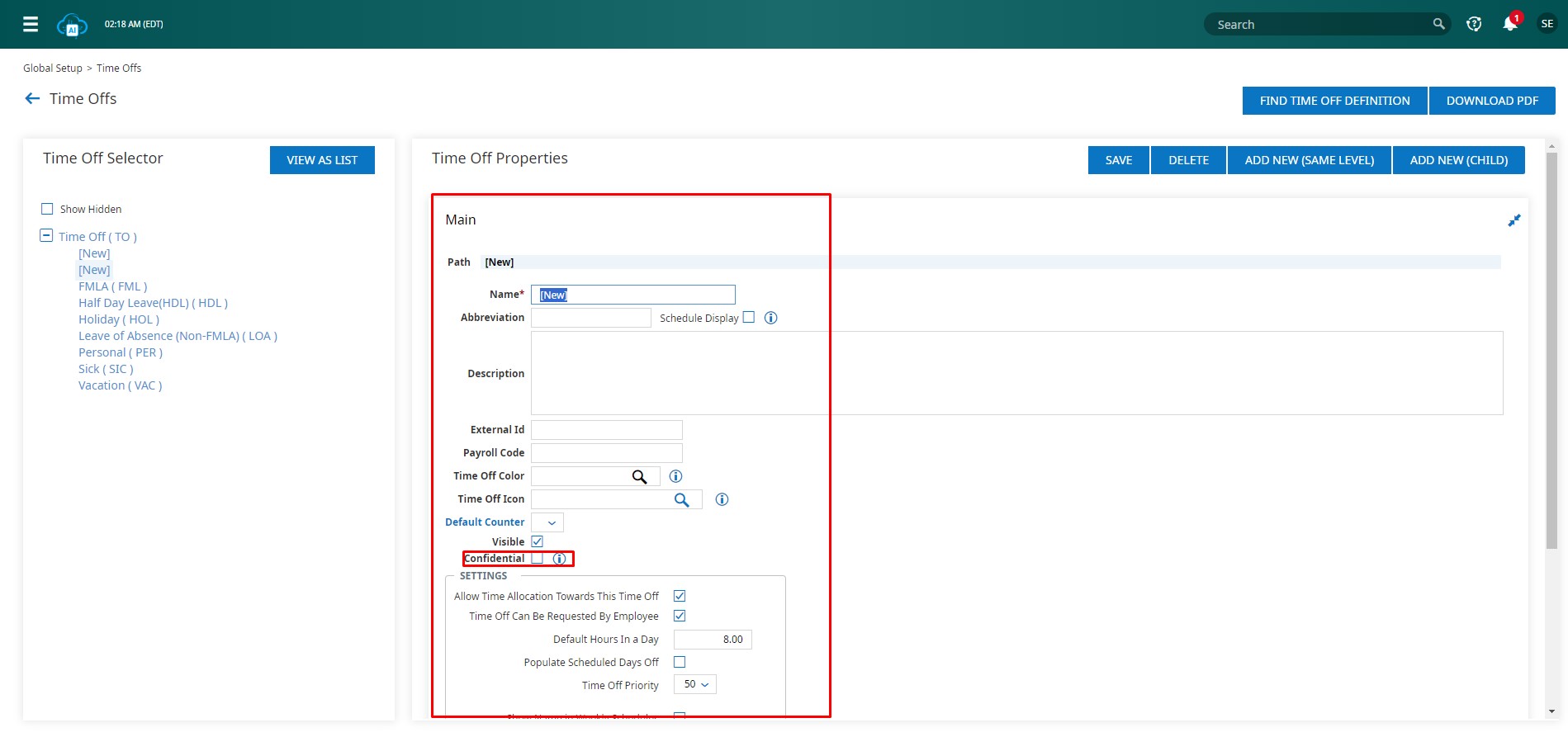Next, proceed to configure the confidential time off. Time Offs are set up in the solution under Global Setup. They follow a structure similar to Cost Centers, allowing for Parent/Child relationships.