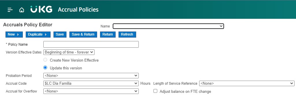 After ensuring all the necessary information in the Policy is complete, click on “Save & Return.” This action finalizes the Accrual Policy, making it ready to be assigned to an Accrual Profile. Once assigned to a Profile, the Policy can then be allocated to an employee.