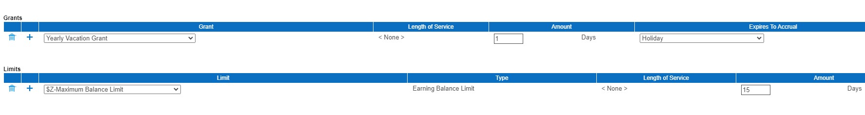 For example, to set a Limit preventing employees from accruing more than 15 days of maximum accrual balance, indicate the starting point on the first anniversary of their employment.Â