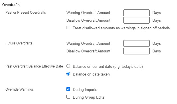 - Override Warnings: This setting determines whether a warning will be generated during Imports or Group Edits if Accrual Overdrafts are being generated.