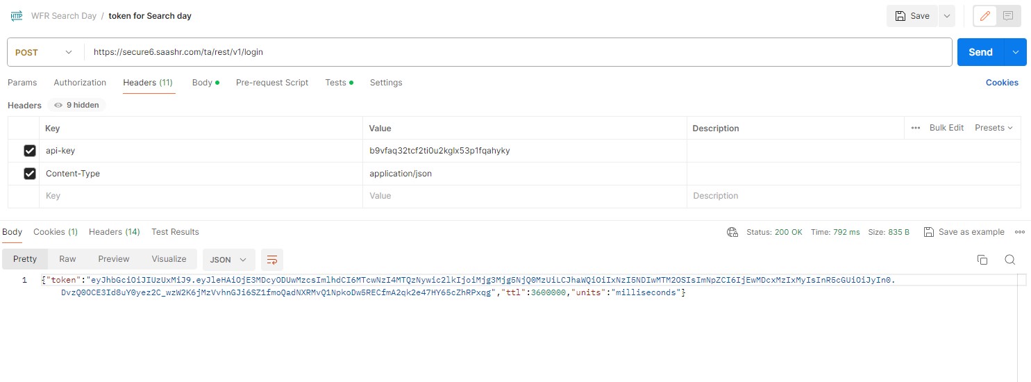 - Set the request method to POST and use the URL “https://secure.workforceready.com.au/ta/rest/v1/login” (replace “secure.workforceready.com.au” with your company URL).
