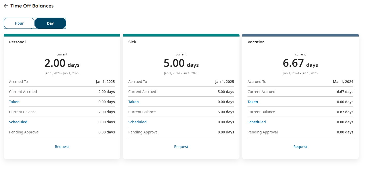 - Limited Information: The page displays information only for time off types that the employee can view and request, ensuring relevance and clarity.