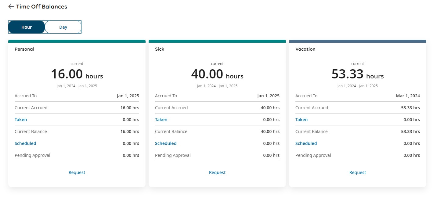 - Limited Information: The page displays information only for time off types that the employee can view and request, ensuring relevance and clarity.