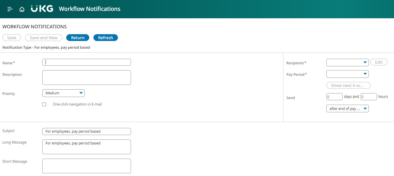 - From the Notification drop-down, choose the Generic Workflow Notification configured for “Request Period.” Only Generic notifications with the “Recipient list will be supplied at runtime” option selected will be available.
