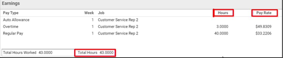 Review the breakdown of Earnings Hours, Total Hours, and Pay Rate for the Hours paid.